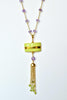 Collana girocollo a rosario in argento 925 placcato oro 18k con pendente in ceramica dipinto a mano con oro 24k, ametista e peridoto alle estremità della nappa. Pendente color verde lime in forma geometrica, con la linea semplice ed elegante, dipinto a mano a pennello con oro zecchino a terzo fuoco.