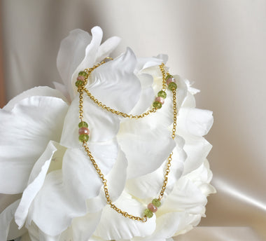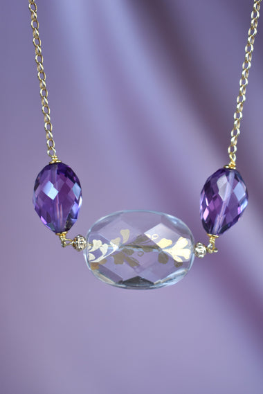 Collana lunga con perle, ametista, quarzo rosa e ceramica dipinta oro 24k