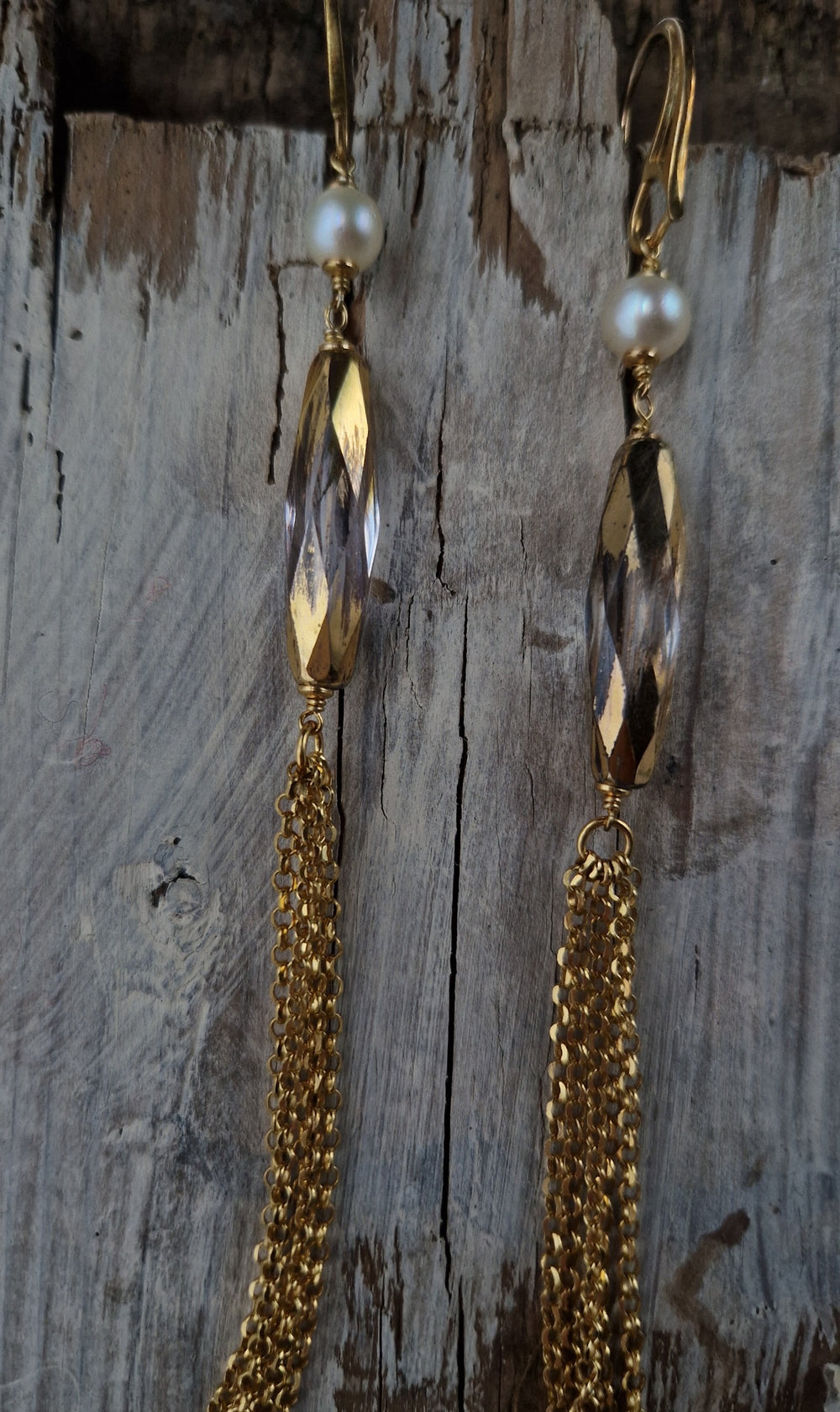 Orecchini pendenti in argento 925 placcato oro 18k con perla d’acqua dolce e cristallo di rocca dipinto a mano con oro zecchino, con la mia gem gilding technique sono un chiaro richiamo ai meravigliosi gioielli Art Decò. Il particolare dei miei orecchini è l’oro puro dipinto su due elementi di cristallo di rocca portato nel forno a quasi 800°C, per fonderlo alla gemma. Solo cristallo di altissima qualità può resistere alle temperature così alte. Il segreto del mio gioiello, oltre ad essere un pezzo unico, è anche nella scelta delle pietre preziose per creare i gioielli in argento placcato oro, e per renderli accessibili a tutti, ma sempre preziosi e destinati a durare per sempre. Pezzo interamente realizzato a mano in Italia.