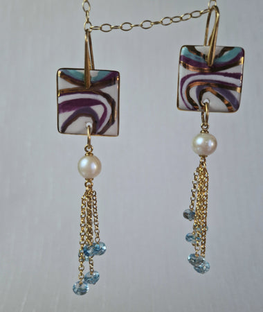 Orecchini in argento con topazio, perle e ceramica dipinta a mano oro 24k