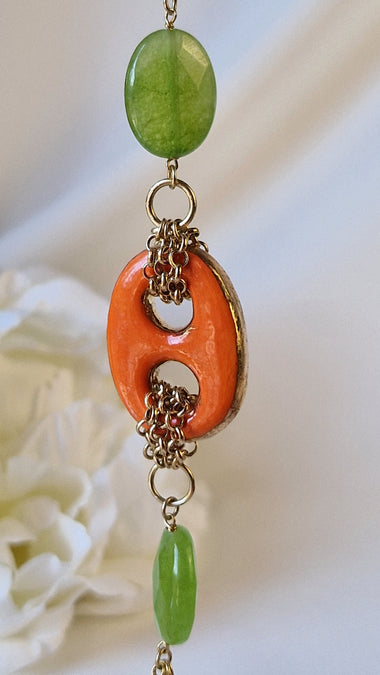 Collana lunga multifilo in argento 925 placcato oro 18k con giada e ceramica dipinta a mano oro 24k