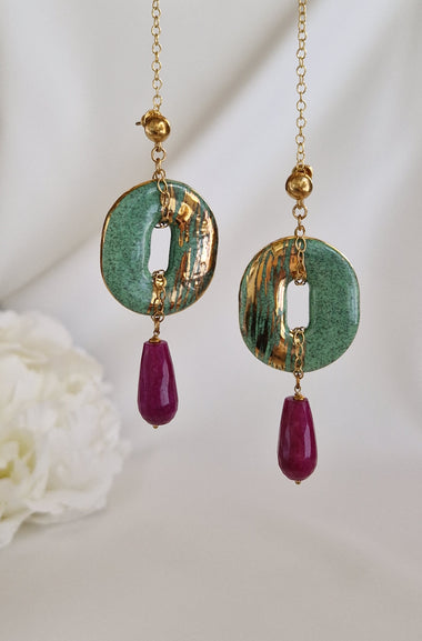 Orecchini pendenti giada e ceramica dipinta oro 24k