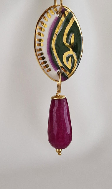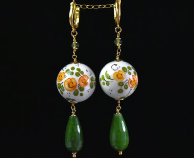 Orecchini pendenti con giada e ceramica dipinta a mano oro zecchino