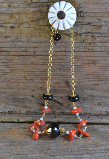 Collana di corallo, acquamarina e onice dipinto oro 24k
