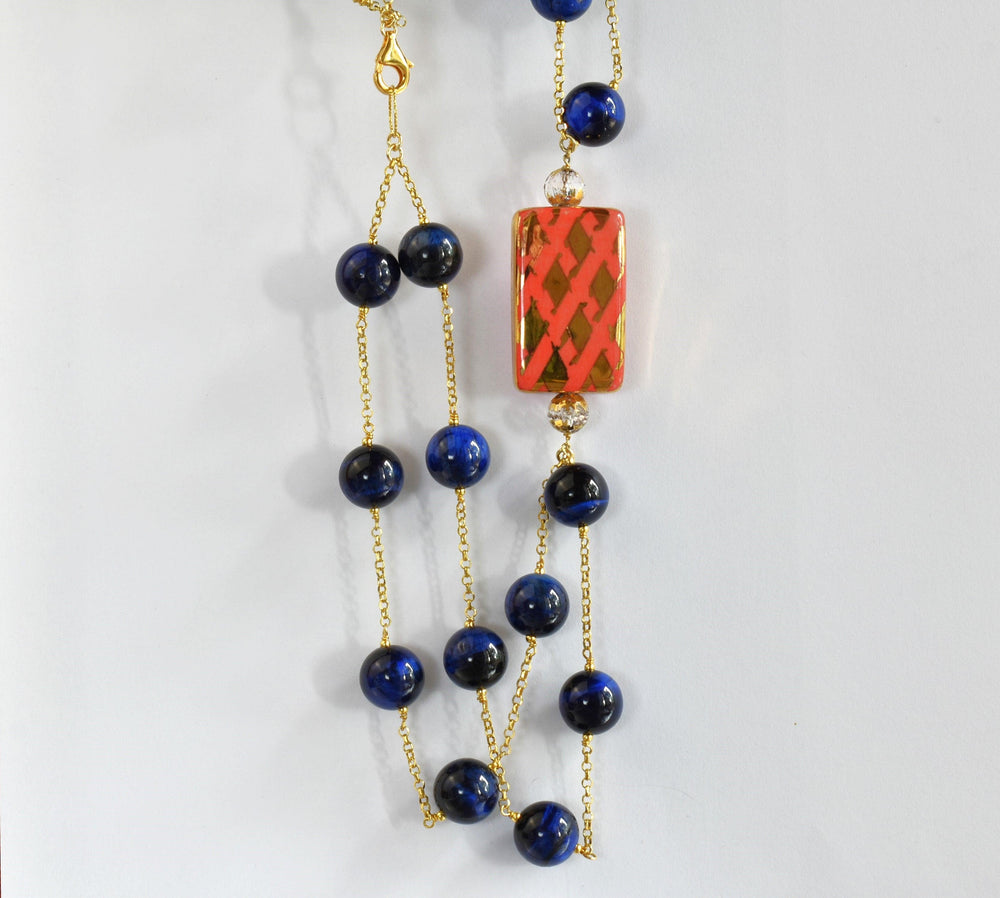Collana donna multifilo in argento 925 placcato oro 18k con elemento centrale in ceramica decorata oro zecchino e occhio di tigre.